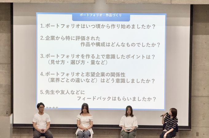 2年前期に授業「キャリアデザイン」を必修科目として開講しています。OB・OG講演や内定者報告会を通して、自分らしい将来やキャリアについて前向きに考える力を育てます。また、ポートフォリオの授業(デザイン学科3年)では、外部講師および実務経験を持つ教員の指導のもと、これまでに制作した作品やプロジェクトを活用しながら、自分のデザインスキルを伝えるポートフォリオ制作に取り組みます。
