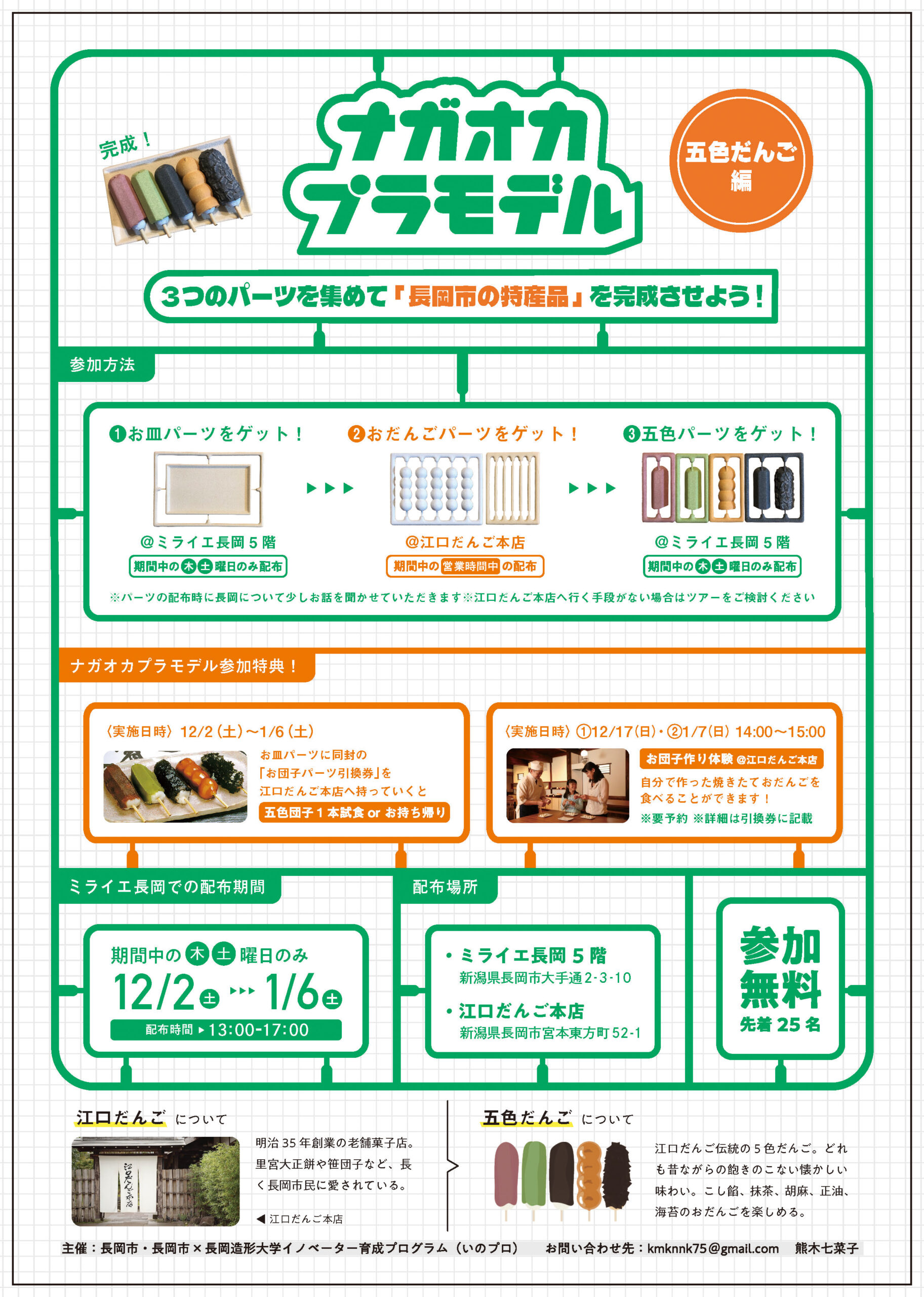 本学大学院 イノベーションデザイン領域の大学院生で、いのプロ3期生の熊木七菜子さんが、12月2日(木)からミライエ長岡5階で江口だんご様の「五色だんご」をプラモデルにした「ナガオカプラモデル」を数量限定で配布しています。