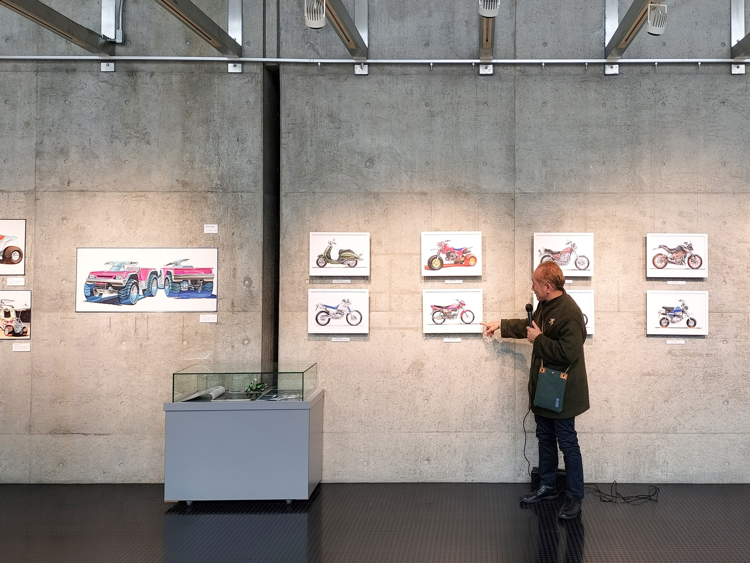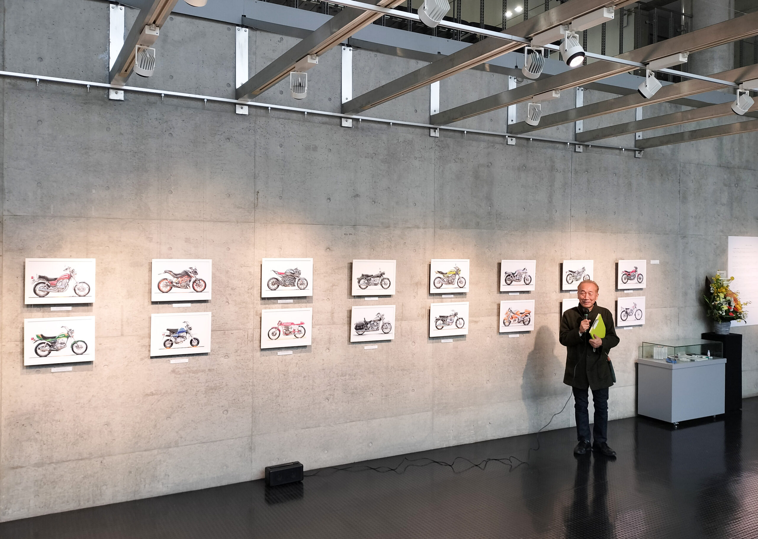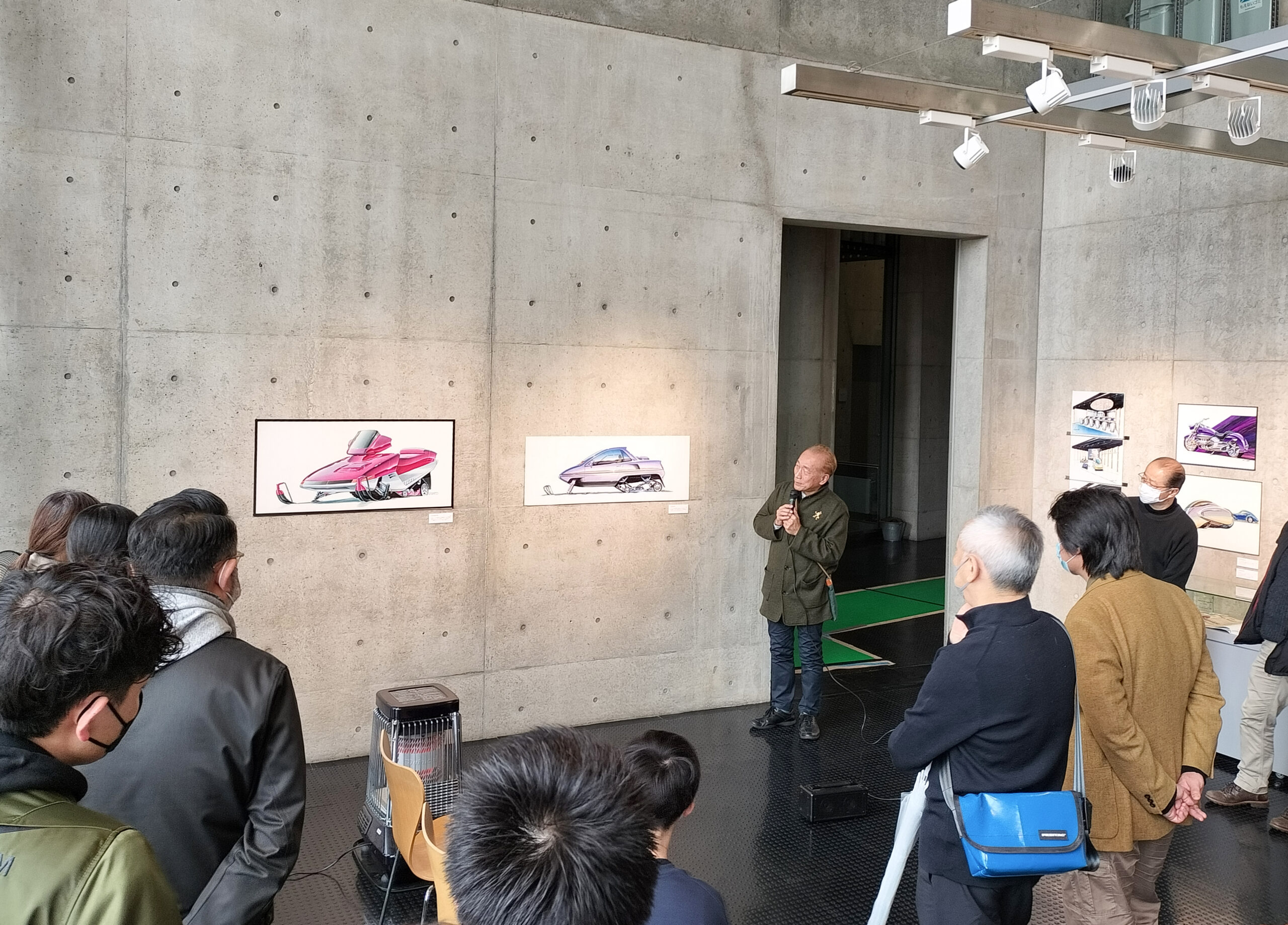 ギャラリートークには学生、卒業生はじめ数十人が集まり、スケッチの解説に加え、学生時代のトランスポーテーションサークルのお話、前職Hondaでのアメリカ勤務のエピソードなどに聞き入りました。