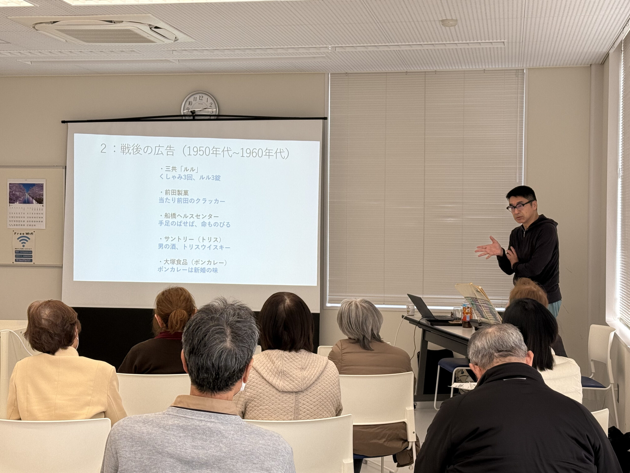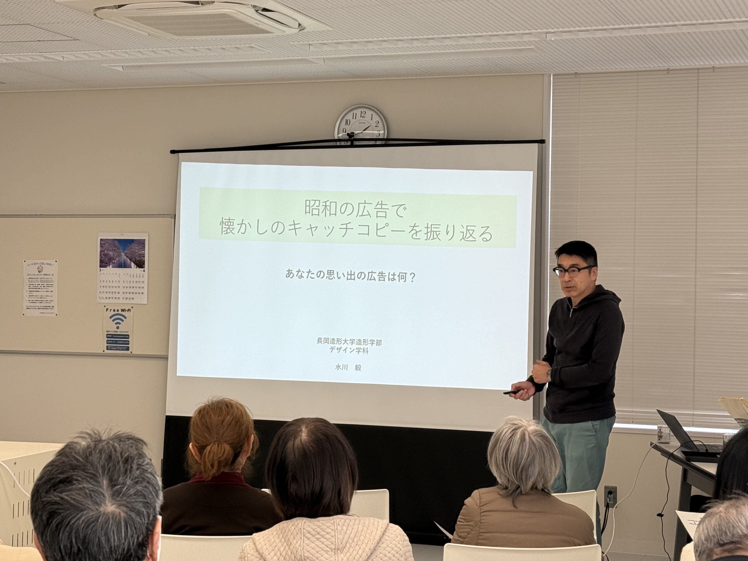 長岡市巻島町の上川西コミュニティセンターで3月21日(金)、本学デザイン学科の水川 毅教授が「昭和の広告で懐かしのキャッチコピーを振り返る」というテーマで出張講義を行いました。