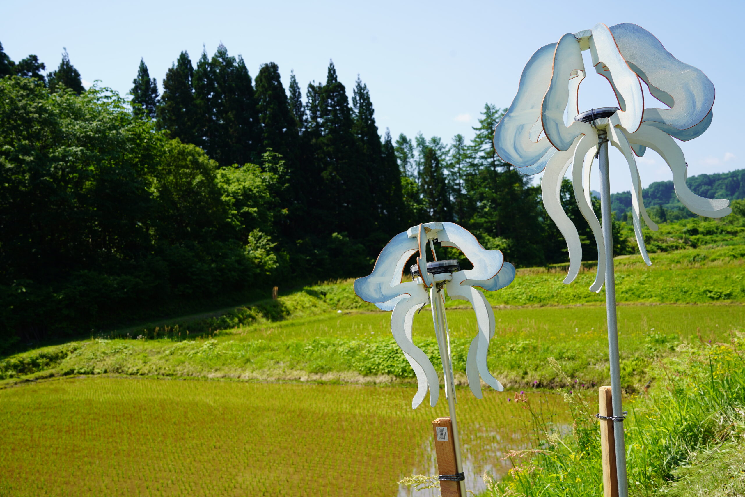 プロジェクトでは、本学学生が棚田の景観を向上させる独創的なカカシを創作し、実際に設置することで、地域の活性化や学生の社会性を涵養することを目指し、活動の過程では創作だけでなく地域の方々と深く交流し、農作業や農村維持作業への参加も行っています。