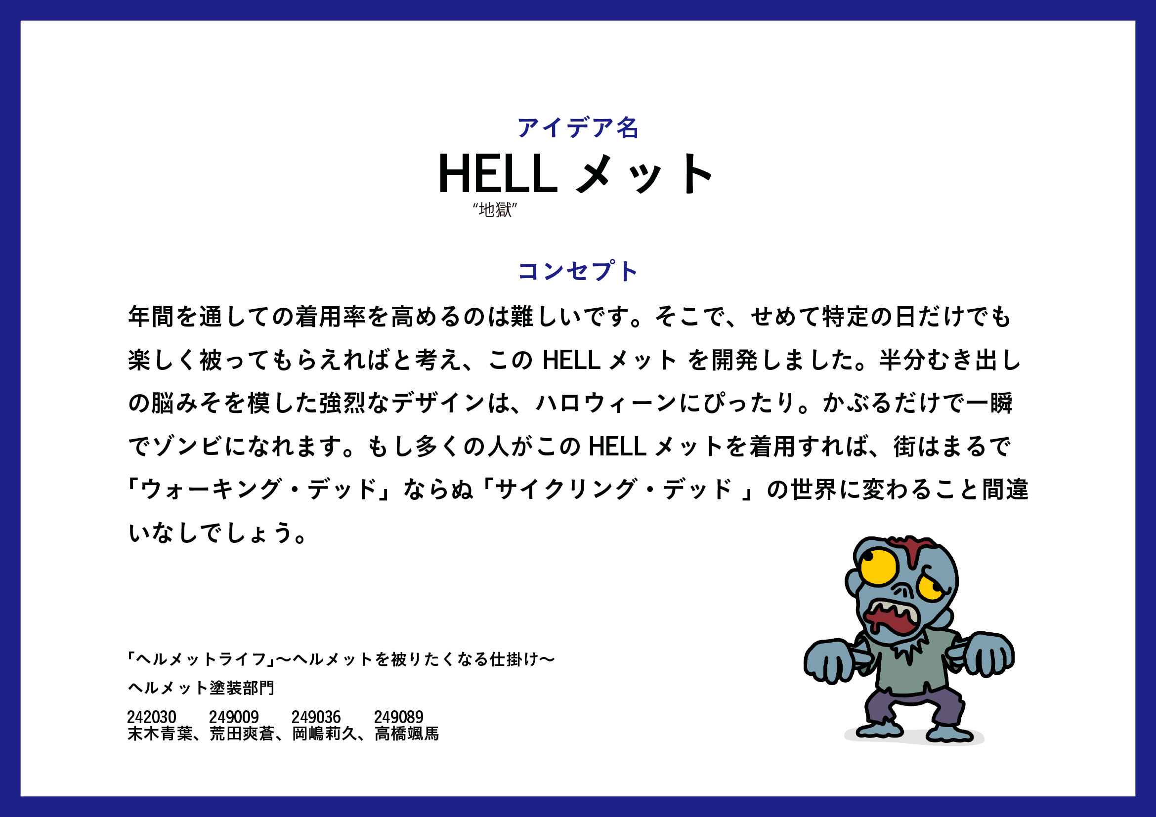 本年度のテーマは、昨年度に続き「『ヘルメットライフ』〜ヘルメットをかぶりたくなる仕掛け〜」として実施しました。