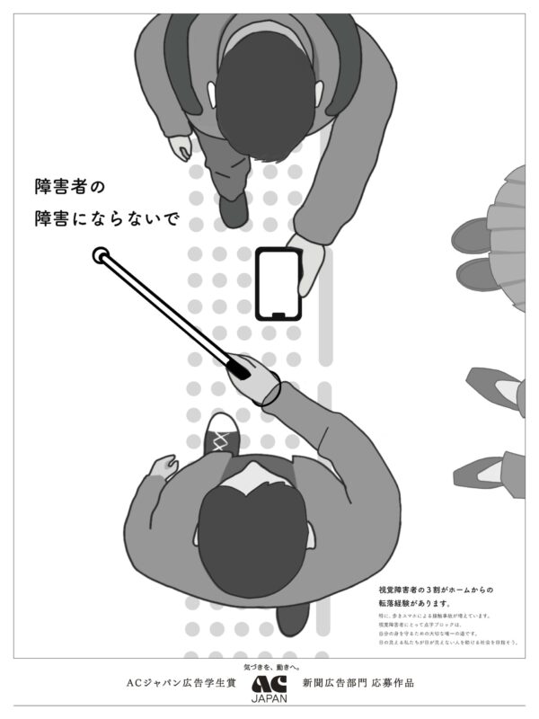 歩きスマホによる視覚障害者との事故が多発している現状を受け、見える人の不注意で傷つけるのではなく支える側になってほしいという思いから制作した。自分も当事者になり得ると感じてもらうことを目的とした。
