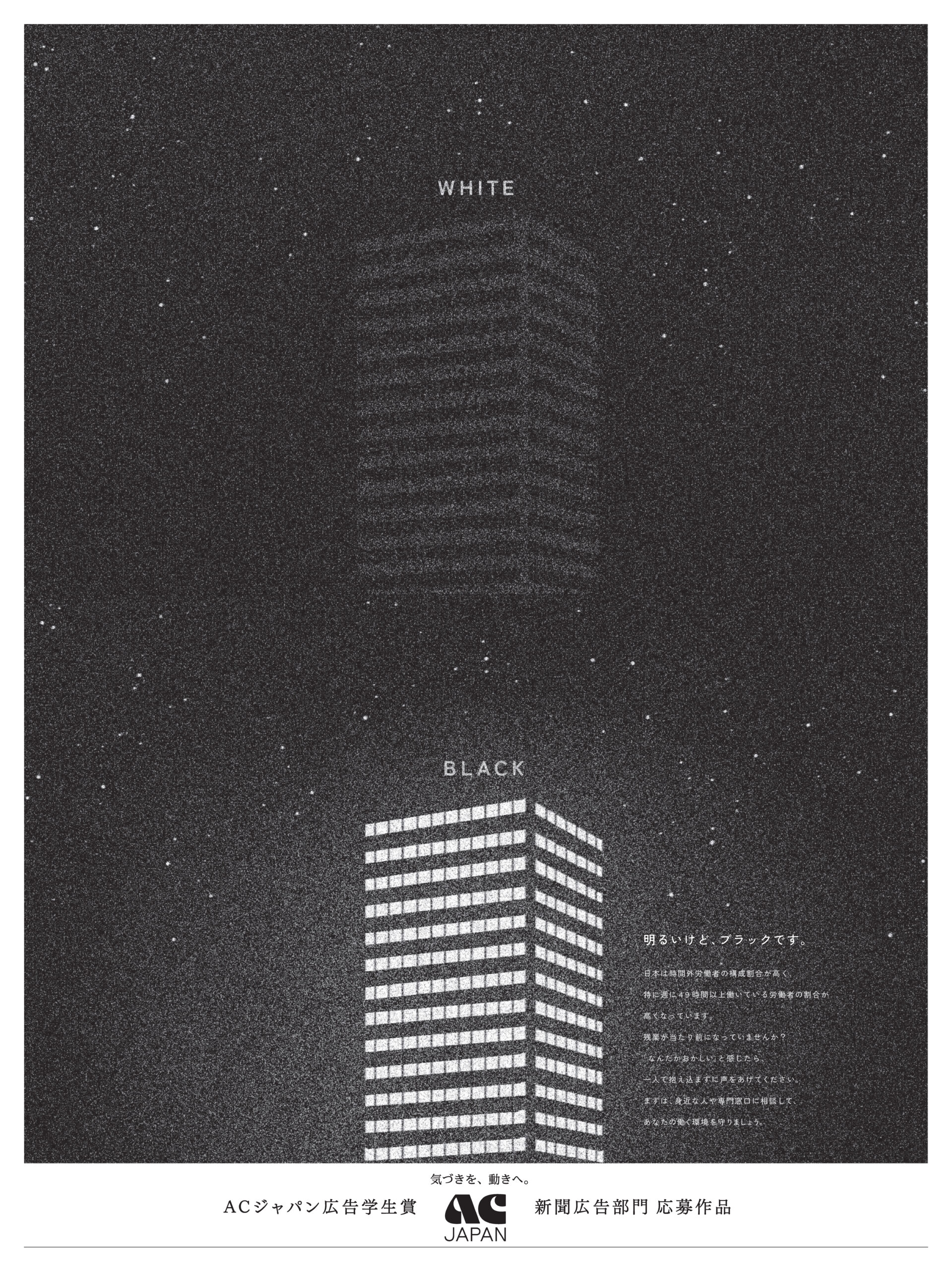 上のビルは定時で社員が帰っているホワイト企業を表現し、下のビルは残業で遅くまで照明がついているブラック企業を表現しています。残業が当たり前になっている方に今一度違和感を抱かせ、周囲への相談を促すポスターとなるよう作成しました。