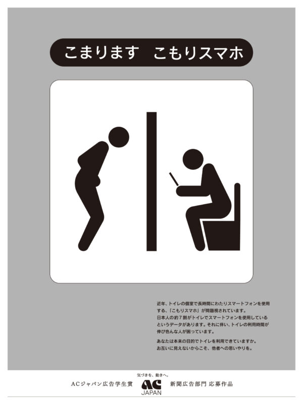 近年、公共トイレの個室にこもり長時間スマートフォンを使用する「こもりスマホ」が問題になっています。状況が見えないので直接注意しづらく、緊急事態でトイレを利用する人もいるので、本来の目的で利用してほしいという思いで制作しました。