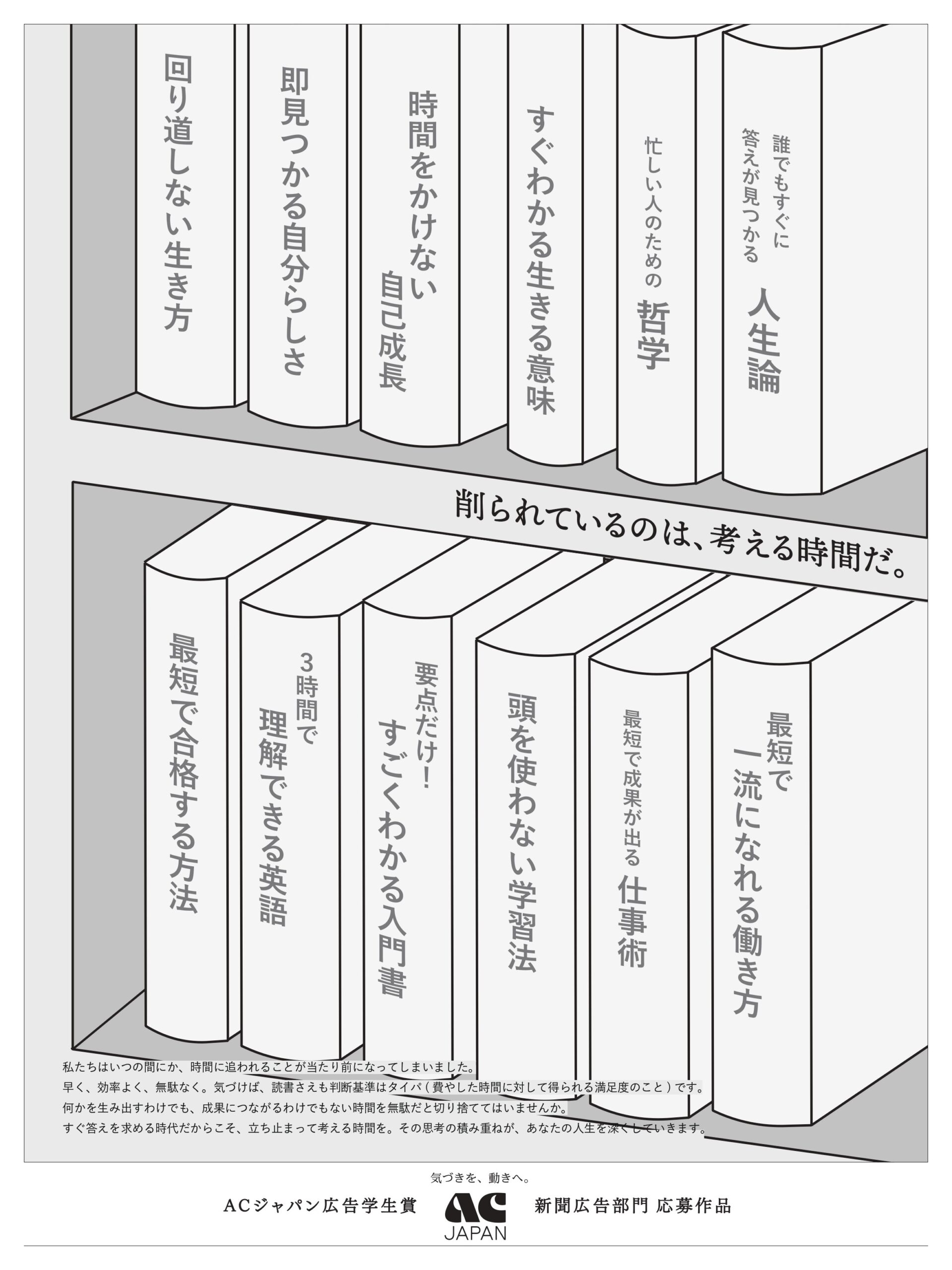 「ACジャパン広告学生賞」は、ACジャパン会員校(大学・大学院・専門学校等)の学生を対象に、公共広告をテーマとした作品を募集・表彰するコンテストです。若い世代が広告制作を通して公共広告への理解を深め、「公」への意識を育むことを目的に開催されています。